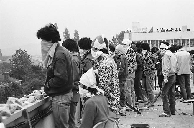 | ▲ 1986년 10월 29일 전국 26개 대학 자민투, 민민투 소속 학생 1700명이 민주조선 대자보 사건으로 건대 본관 건물을 점거한채 농성하고 있다 |