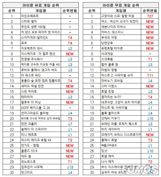 이번 주 아이폰 무료 게임 순위에서는 신작 게임이 강세를 보였다. 넷마블의 대표 IP이 '세븐나이츠'의 리메이크 타이틀인 '세븐나이츠 리버스'가 출시와 함께 3위를 차지했다.