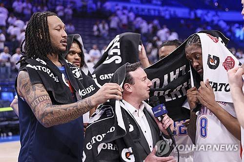 Reporter Nick Gallo, center, interviews Oklahoma City Thunder forward Jalen Williams (8) as forward Jaylin Williams, left, and teammates put towels on them following Game 1 of an NBA basketball Western Conference Finals playoff series against the Minnesota Timberwolves Tuesday, May 20, 2025, in Oklahoma City. (AP Photo/Nate Billings)