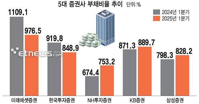금융감독원 전자공시시스템(DART)에 따르면 국내 주요 5대 증권사(미래에셋증권·삼성증권·한국투자증권·KB증권·NH투자증권) 올해 1분기 평균 부채비율은 859.4%로 전년 동기(874.5%)에 비해 15.1%포인트(P) 낮아진 것으로 나타났다.