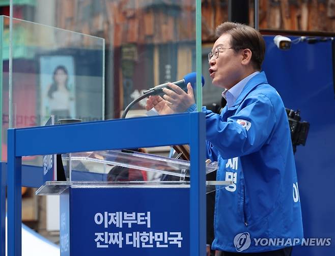 (인천=연합뉴스) 김주성 기자 = 더불어민주당 이재명 대선 후보가 21일 인천광역시 남동구 구월 로데오광장에서 열린 유세에서 시민들에게 지지를 호소하고 있다. 2025.5.21
