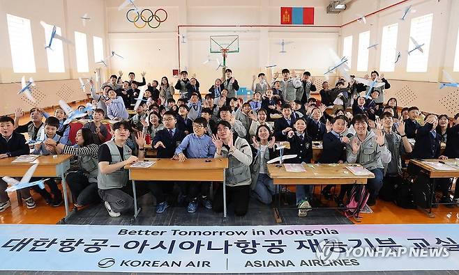 (서울=연합뉴스) 대한항공과 아시아나항공 임직원들이 21일 몽골 울란바토르시 바가노르구에 위치한 군갈루타이 국립학교에서 항공공학 체험 수업을 진행, 학생들과 기념 촬영하고 있다. 2025.5.21 [공항사진기자단]