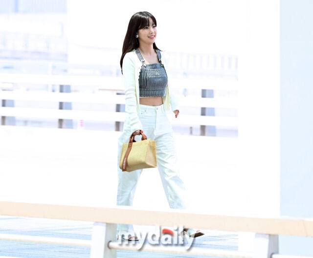 ▲ 화이트 팬츠와 카디건, 스프라이트 패턴 서스펜더 크롭티, 라탄 클러치 등 청량 아이템 다 모였네.