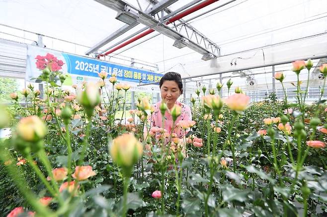 [서울=뉴시스] 21일 전북 완주군 농촌진흥청 국립원예특작과학원 장미 온실에서 장미 품종 평가회가 열린 가운데 평가 참여자들이 국산 장미 품종을 살펴보고 있다. (사진=농촌진흥청 제공) 2025.05.21. photo@newsis.com *재판매 및 DB 금지