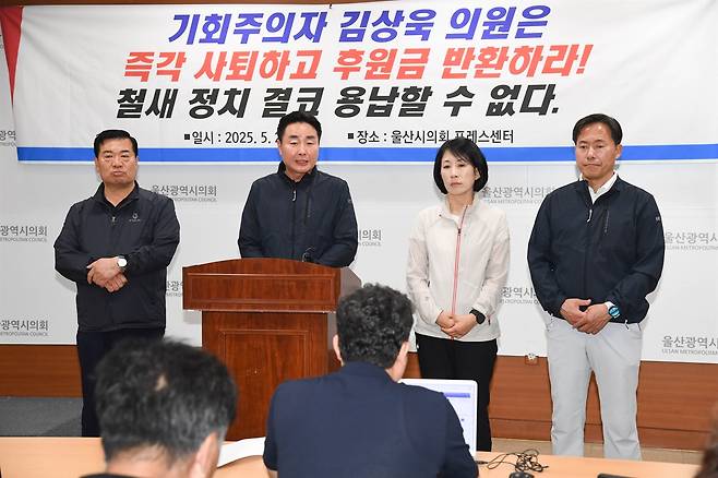국민의힘 소속 이정훈·이장걸 울산시의원과 이지현·이소영 남구의원은 21일 울산시의회 프레스센터에서 기자회견을 열고 "김상욱 의원의 탈당과 입당은 지역 유권자와의 신뢰를 저버린 배신 행위"라고 힐난했다. 이들은 "국민의힘 공천으로 당선된 의원이 정반대 성향의 정당으로 이동한 것은 민주주의 대표로서의 원칙을 스스로 파괴한 것"이라고 주장했다.