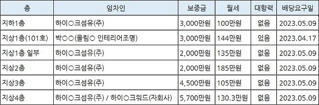지하 1층: 하이ㅇ크섬유(주) 대항력 없음