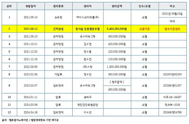 가장 중요한 권리는 **2021년 9월 13일 동서울신협이 설정한 근저당권(546억 원)**으로, 이는 말소기준권리로 작용합니다.