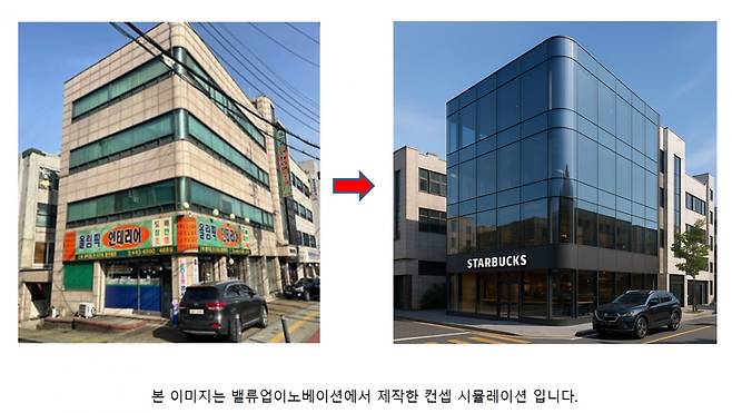기존 건물은 석재 외벽 마감으로 고급스러움을 연출했지만, 향후 리노베이션을 통해 커튼월 외장 방식으로 변경 시 세련된 이미지와 현대적 느낌을 강화할 수 있습니다.