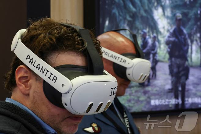 (도쿄 로이터=뉴스1) 신기림 기자 = 21일 일본 도쿄 인근 지바현 소재 전시장인 마쿠하리 메세에서 열린 방위 보안 장비 전시회(DSEI) 재팬에서 사람들이 군사작전용 인공지능 플랫폼 '팔란티어 메이븐 스마트 시스템'을 체험하고 있다. 2025.5.21