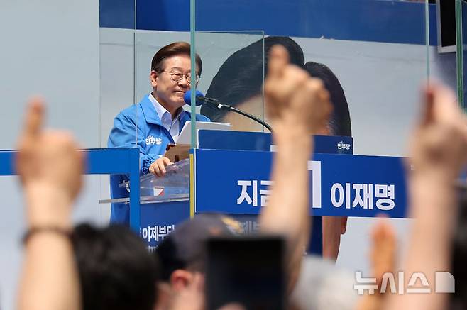[인천=뉴시스] 조성우 기자 = 이재명 더불어민주당 대선후보가 21일 인천 남동구 구월로데오광장에서 열린 유세에서 연설을 하고 있다. 2025.05.21. xconfind@newsis.com