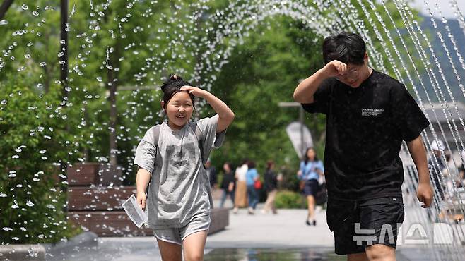 [서울=뉴시스] 조수정 기자 = 여름으로 들어서는 절기 '소만(小滿)'인 21일 서울 종로구 광화문광장에서 어린이들이 분수 터널을 즐기고 있다. 2025.05.21. chocrystal@newsis.com