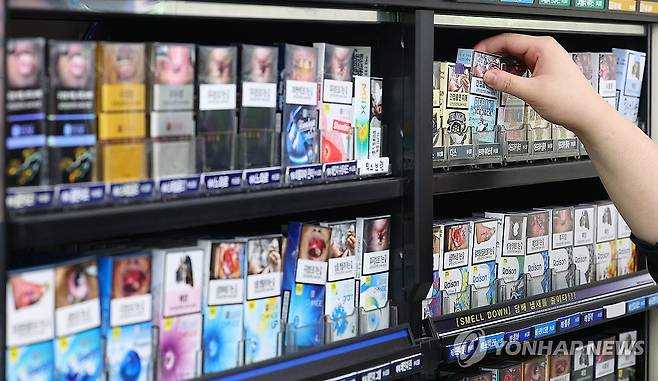 (서울=연합뉴스) 김도훈 기자 = 국민건강보험공단과 담배 회사들이 12년째 벌이고 있는 500억원대 '담배 소송' 항소심 최종 변론을 하루 앞둔 21일 오전 서울 시내의 한 편의점 담배판매대 모습.