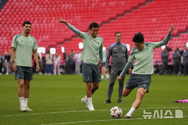 [빌바오=AP/뉴시스] 토트넘 홋스퍼의 손흥민이 20일(현지 시간) 스페인 빌바오의 산 마메스 경기장에서 열릴 2024-25 유럽축구연맹(UEFA) 유로파리그(UEL) 맨체스터 유나이티드와의 결승전을 앞두고 동료들과 훈련하고 있다. 2025.05.21.