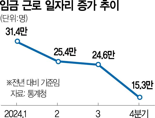 통계청이 21일 발표한 ‘2024년 4분기 임금근로 일자리 동향’에 따르면 지난해 4분기 전체 임금근로 일자리는 2090만 2000개로 전년 동기보다 15만 3000개 증가했다. 이는 2018년 분기별 통계가 집계되기 시작한 후 가장 낮은 증가 폭이다. 임금근로 일자리는 근로자가 점유한 고용 위치를 나타내며 한 사람이 2개 이상의 일자리를 갖고 있는 경우에는 각각 집계된다.