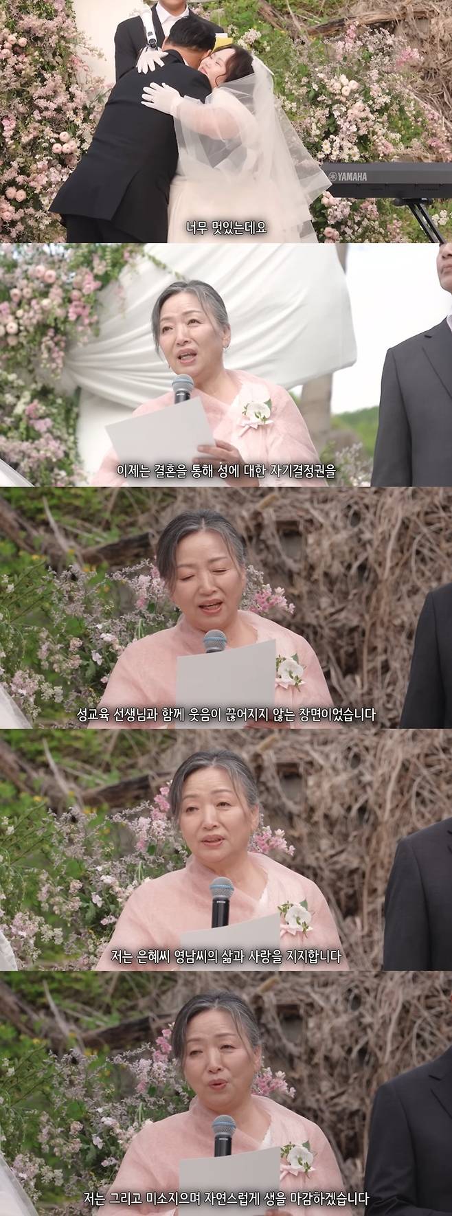 노희경 작가는 "그 누구보다 은혜와 영남씨는 잘 살거다. 서로에 대한 몰입력으로 모든 걸 이겨낼 거다. 불행이 와도 서로의 눈을 보고 희망을 다시 가질 거다"라며 이들의 결혼을 진심으로 축하했다.
