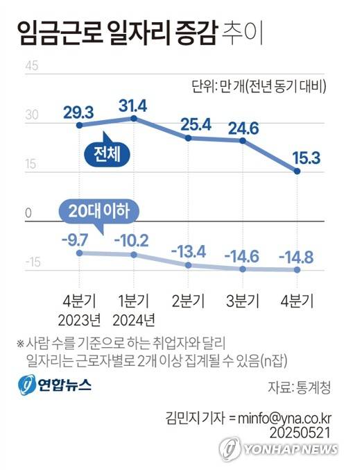 (서울=연합뉴스) 김민지 기자 = 통계청이 21일 발표한 '2024년 4분기 임금 근로 일자리 동향'에 따르면 작년 4분기 전체 임금 근로 일자리는 1년 전보다 15만3천개 늘어나 관련 통계 작성 이래 최소 증가 폭을 기록한 것으로 나타났다.