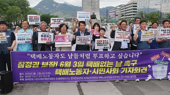 ▲ 전국택배노조와 시민사회단체들이 21일 서울 광화문광장에서 대통령 선거일인 6월 3일 택배 없는 날 촉구 기자회견을 하고 있다.