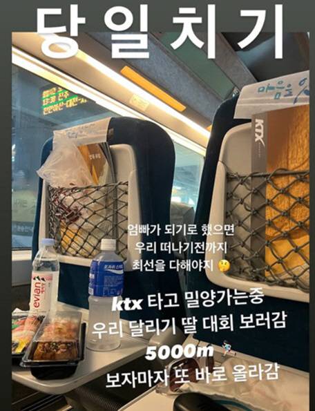 진태현은 21일 "당일치기"라며 "엄마 아빠가 되기로 했으면, 우리 떠나기 전까지 최선을 다해야지. KTX 타고 밀양가는 중. 우리 딸 달리기 대회 보러감"이라고 전했다.