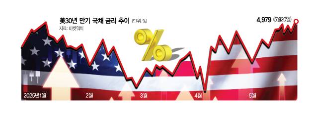 20일(현지 시간) 30년 만기 미국 국채금리는 전 거래일보다 7.4bp(bp=0.01%포인트) 급등한 4.979%를 기록했다. 트럼프 대통령 취임 직전 관세로 인해 미국 달러와 시중금리가 뛸 것이라는 전망이 컸던 1월 14일(4.980%) 이후 가장 높은 수준이다. 30년물 금리가 종가 기준 5%를 넘어선다면 연준의 기준금리가 정점을 찍은 직후였던 2023년 10월 이후 처음이라는 기록을 세우게 된다.