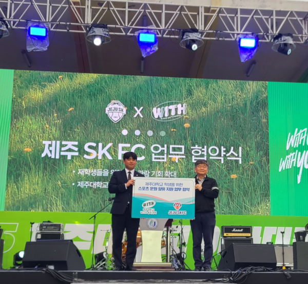 제주SK FC(이하 제주SK)가 제주대학교 WITH총학생회(회장 김지완)와 업무협약을 체결했다. 협약식은 2025 제주대학교 아라대동제 개막식에서 구창용 제주SK 대표이사와 김지완 제주대학교 총학생회장이 참석한 가운데 진행됐다.