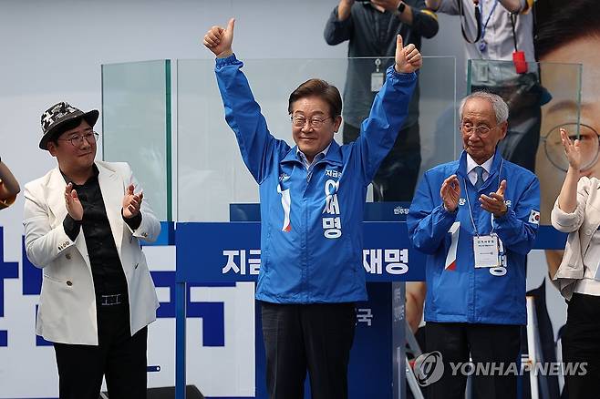 (인천=연합뉴스) 김주성 기자 = 더불어민주당 이재명 대선 후보가 21일 인천광역시 부평역 북광장에서 열린 집중유세에서 시민들에게 인사하고 있다. 2025.5.21 [공동취재]