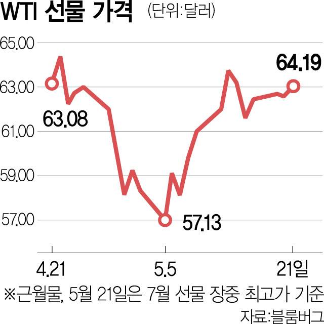 이날도 이스라엘의 이란 공습 가능성이 언급되자 국제유가가 급등하며 불안한 모습을 보였다. 7월물 서부텍사스산원유(WTI) 선물 가격은 21일 장중 전일 대비 약 3.5% 급등한 배럴당 64.19달러에 거래됐다.