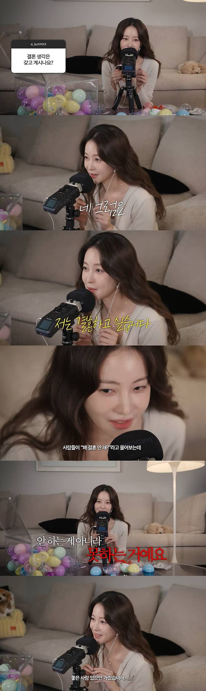 결혼 계획에 대한 질문에는 "결혼하고 싶다. 사람들이 '왜 결혼 안 해?'라고 물어보는데 안 하는 게 아니라 못하는 거다"며 속내를 드러냈다. 이어 "좋은 사람 있으면 가겠다. 유튜브에서 공개하고 결혼하겠다. 언젠가"라며 결혼에 대한 의지를 내비쳤다.