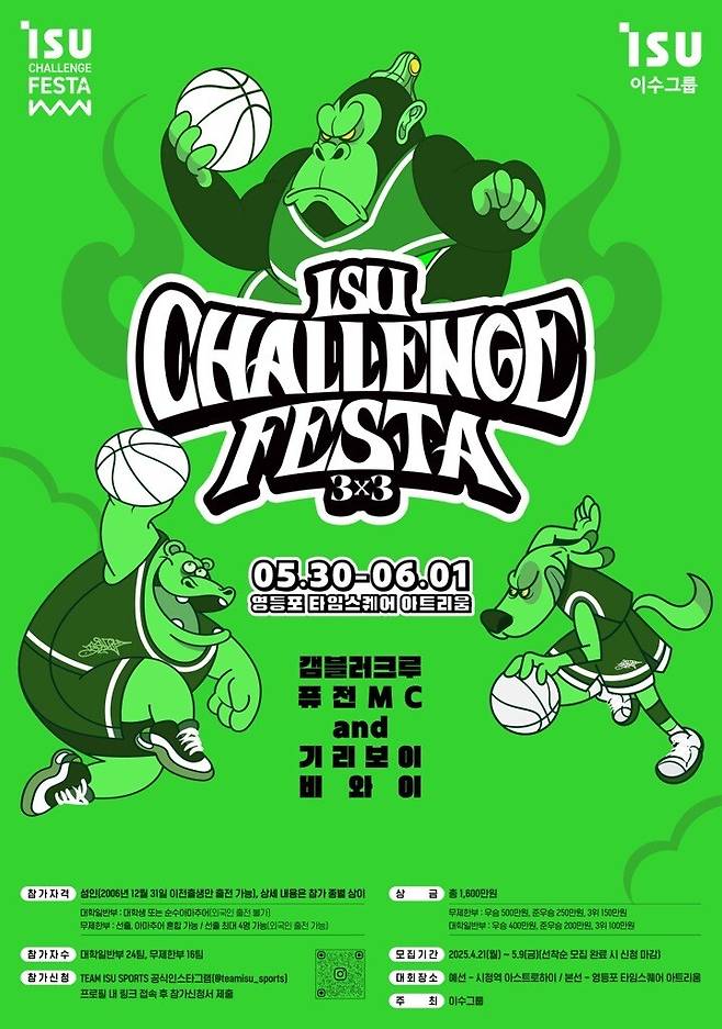 이수그룹이 주최하는 '이수챌린지페스타 3X3 2025(이하 이수챌린지페스타)' 대회가 오는 30일부터 6월 1일까지 3일 간 서울 시청역 아스트로하이와 서울 영등포 타임스퀘어 2개소에서 펼쳐진다.