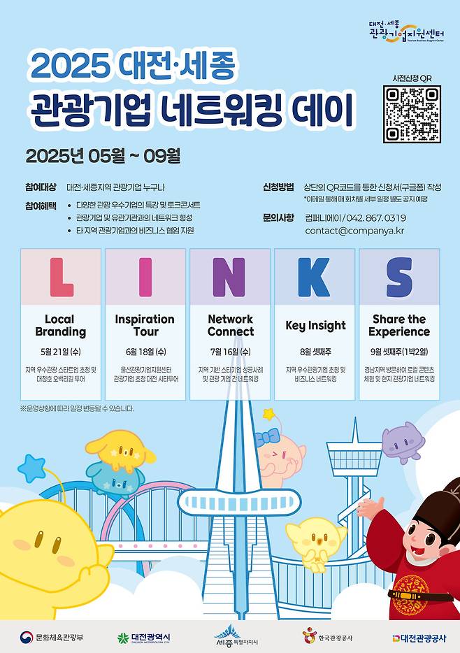 한편 '2025 대전·세종 관광기업 네트워킹 데이'는 대전·세종관광기업지원센터 사업 참여기업, 관광분야업 종사자 누구나 참여 가능하며, 회차별 참가 신청 및 행사 세부 내용은 포스터 내 QR코드 또는 대전․세종관광기업지원센터 홈페이지(http://tourbiz.daejeonsejong.or.kr/)에서 확인할 수 있다.