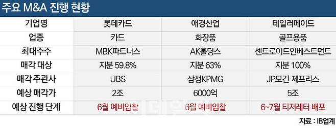 [이데일리 마켓in 허지은 기자] 오는 6월 롯데카드와 애경산업이 매각을 위한 예비입찰을 진행한다. 롯데카드 최대주주 MBK파트너스는 2022년 이후 3년 만에 희망 매각가를 2조원으로 낮췄고, 수출 위주의 알짜 계열사로 꼽히는 애경산업도 새 주인 찾기에 나선다. 최대 몸값 5조원이 거론되는 골프용품 브랜드 테일러메이드도 이르면 다음달 중 티저레터(투자안내서) 배포를 앞두고 있어 모처럼 대형 매물이 많은 한 달이 될 전망이다.