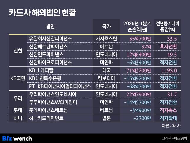 신한카드는 미얀마법인이 올해 1분기 6억3400만원의 손실을 내면서 적자 전환했지만, 카자흐스탄법인과 인도네시아법인의 순이익이 전년 동기 대비 각각 33.5%, 49.5% 증가했다. 베트남법인 역시 올해는 32억원 흑자를 거뒀다.