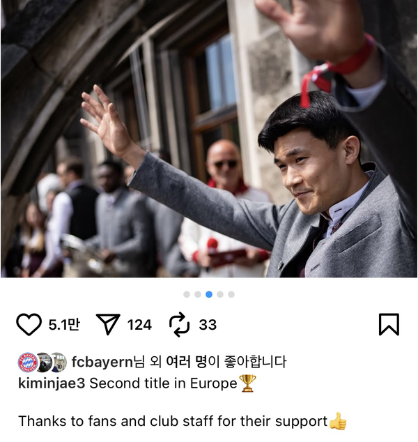 그러한 상황에서도 김민재는 의연했다. 김민재는 본래 SNS 활동을 하지 않는 것으로 유명하지만, 지난 20일(한국시간) 이례적으로 게시물을 올렸다. 김민재는 우승 세리머니를 하는 사진 여러 장을 게재하며 “유럽에서의 두 번째 트로피입니다. 응원해주신 팬들과 구단 관계자분들께 감사드립니다”라며 짧고 굵게 고마운 마음을 전했다.