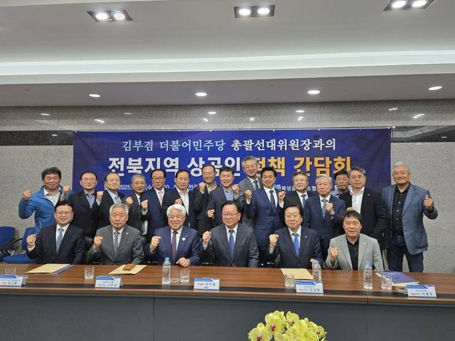 더불어민주당 김부겸 총괄선대위원장이 21일 전주상공회의소에서 전북 지역 상공인들과 만나 지역경제 활성화와 균형발전을 위한 정책간담회를 가졌다.