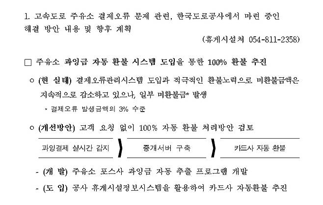 | ▲ 한국도로공사 국회답변 자료(2024.11) 한국도로공사는 주유소 결제오류를 해결하기 위해 중개서버를 구축하고 과잉금 자동 추출 프로그램 개발하며, 카드사와 연계한 자동환불시스템을 개발하겠다고 밝혔다 |