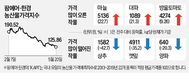 21일 팜에어·한경 농산물가격지수(KAPI)를 산출하는 가격 예측 시스템 테란에 따르면 지난 20일 도매시장 기준 국내 거래 상위 22개 농산물 중 15개 품목의 가격이 1주일 전보다 하락했다. 전년 동월과 비교해도 17개 품목 가격이 내렸다. 농산물값은 노지 수확이 늘어나는 5~6월과 10~11월이 가장 저렴하다.