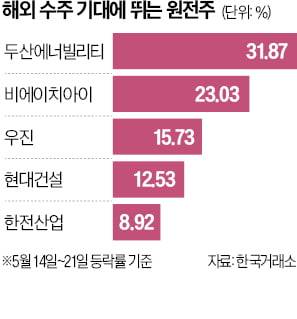 두산에너빌리티 시가총액은 약 25조원으로 단숨에 유가증권시장 기업 중 13위로 올라섰다. 지난달 말 21위였는데 이달 들어 여덟 계단 뛰어올랐다. 1주일간 비에이치아이 주가는 23.03% 올랐고 우진(15.73%) 현대건설(12.53%) 등도 마찬가지였다. ‘HANARO 원자력iSelect’(14.39%), ‘ACE 원자력테마딥서치’(11.96%) 등 원자력 관련 상장지수펀드(ETF) 역시 1주일 새 눈에 띄는 수익률을 기록했다.