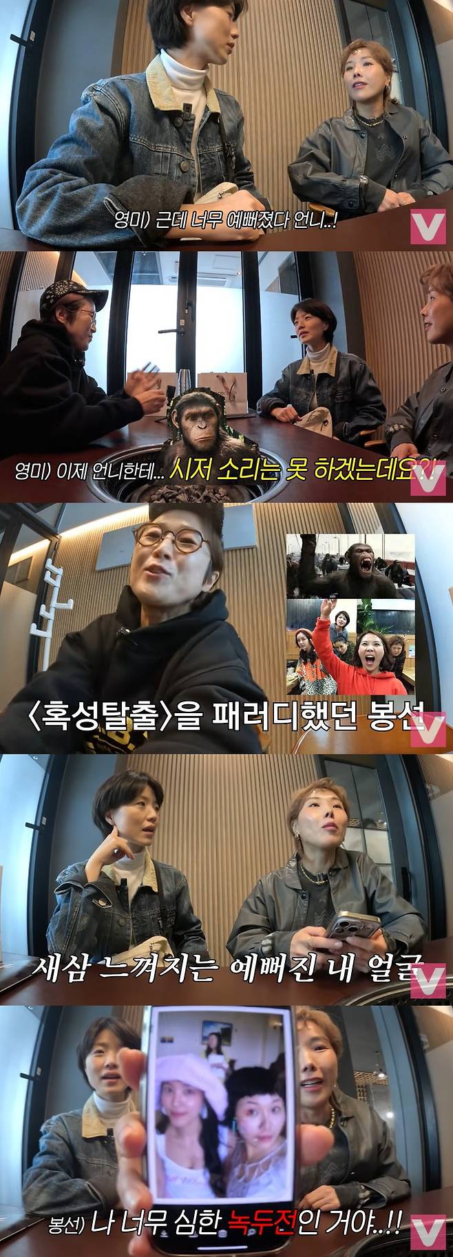 송은이도 "봉선이 진짜 예뻐졌다"고 거들자, 안영미는 "이제 언니한테 (영화 '혹성탈출') 시저 소리는 못 하겠다"며 원숭이 흉내를 냈던 그의 과거를 떠올렸다.