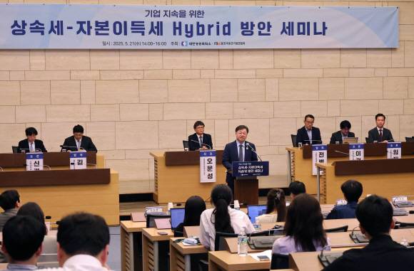 대한상공회의소와 한국중견기업연합회는 21일 서울 중구 상의회관에서 '기업 지속을 위한 상속세-자본이득세 하이브리드 방안' 세미나를 열었습니다.