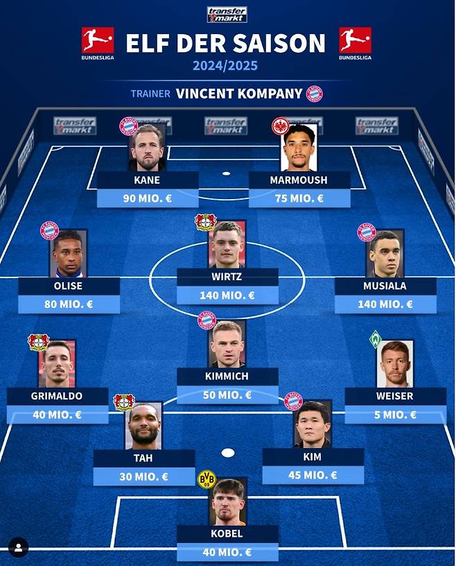 독일 이적시장 전문 매체 '트랜스퍼마르크트'는 20일(한국시간) 사회관계망서비스(SNS)를 통해 팬들이 선정한 2024-25시즌 분데스리가 베스트 11을 발표했다.