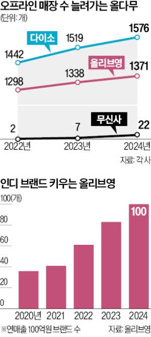 21일 유통업계에 따르면 올리브영, 다이소, 무신사의 오프라인 매장 수는 작년 기준 합산 2969개다. 2022년에 비해 점포가 227개 늘었다. 이 기간 올리브영 매장이 73개, 다이소가 134개, 무신사가 20개 증가했다. 같은 기간 이마트가 136개에서 133개로, 홈플러스는 133개에서 127개로 점포를 줄인 것과 대비된다.