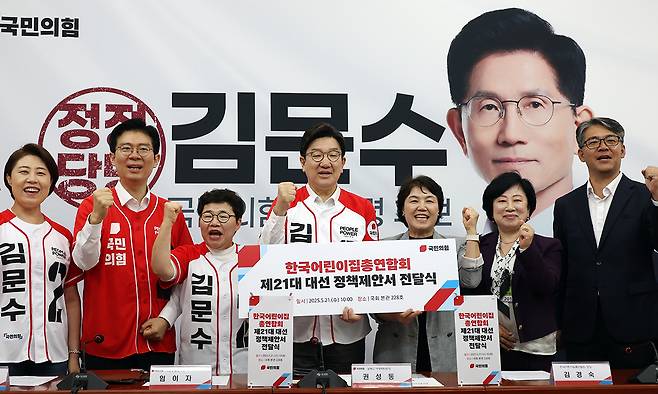 | 정책제안서 전달받아 국민의힘 권성동 공동선거대책위원장(왼쪽 네번째)이 21일 서울 여의도 국회에서 김경숙 한국어린이집총연합회장(〃 다섯번째)을 만나 정책제안서를 받고 기념촬영하고 있다. 왼쪽에서부터 국민의힘 서지영 홍보기획단장, 조정훈 전략기획부총장, 임이자 선대위 부위원장. 뉴시스 |