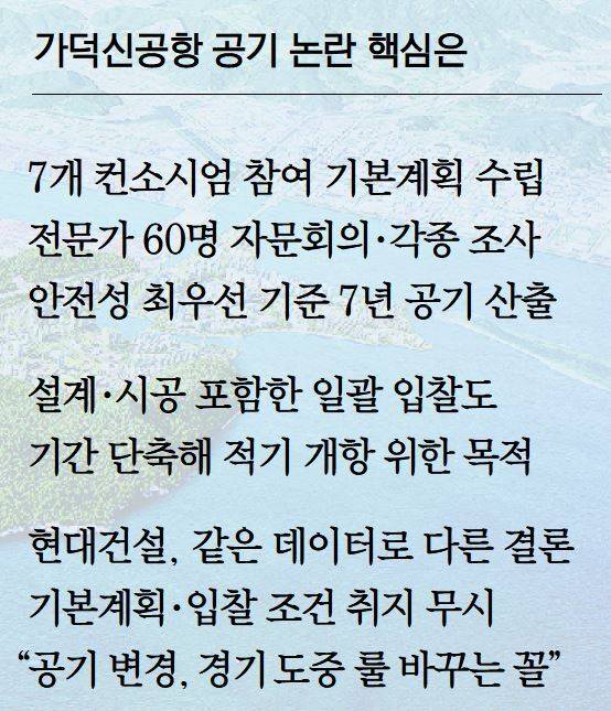 현대건설 컨소시엄은 연약지반 안정화에 17개월, 방파제 건설과 매립을 병행하는 대신 방파제를 일부 시공한 뒤에 매립을 시작하도록 공사 순서를 조정하는 데 7개월 등 총 24개월이 더 필요하다고 제시했다. 현대건설이 기본설계에 적용한 활주로 구간 시추 조사 데이터와 설계 기준 파랑은 정부 기본계획에서 적용한 것과 동일하다.