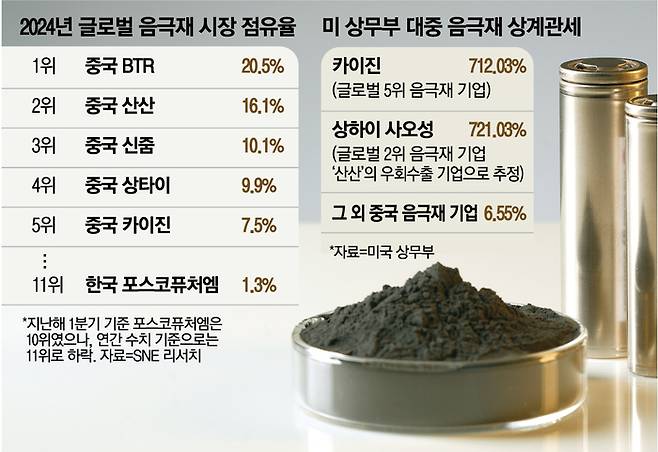 중국 주요 음극재 기업들에 고율 관세가 확정되면 국내 기업은 수혜를 볼 전망이다. 글로벌 음극재 점유율 순위에서 유일하게 10위권에 있는 포스코퓨처엠은 ‘비중국 음극재’의 유일한 대안으로 평가받는다. 포스코퓨처엠 관계자는 “중국이 음극재를 40~50% 싸게 판매하고 있어서 가격경쟁에 어려움을 겪어왔다”며 “대중 관세로 인해 음극재 시장가격이 확정되면 미국향 배터리사업에서 공급 기회가 늘어날 것”이라고 기대했다.