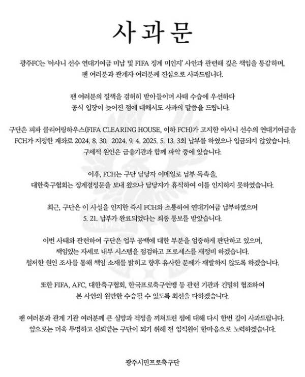 [공식]"진심으로 사과드립니다" 광주, 연대기여금 논란 일주일만에 공식 사과문 게재…21일 납부 최종확인