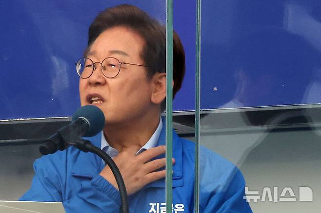 [인천=뉴시스] 조성우 기자 = 이재명 더불어민주당 대선 후보가 21일 인천 계양구 계양역 앞에서 열린 유세에서 피습 당한 부위를 만지며 발언하고 있다. 2025.05.21. xconfind@newsis.com