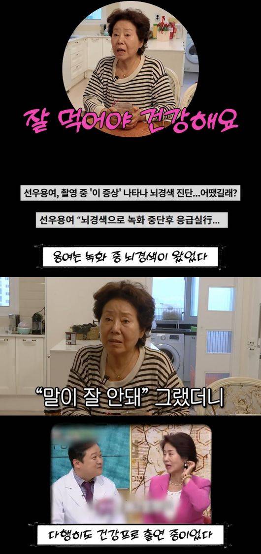 한편, 제작진은 “녹화하던 중 갑자기 팔이 안 올라갔다던데”라며 촬영 중 뇌경색이 왔던 일을 언급했다. 이에 대해 선우용녀는 “그때가 8월달인데 녹화를 가야되는데 약간 덥더라. 여름이니까 덥다고 생각하고 갔는데 녹화를 막 하는 도중인데”라고 말문을 열었다.