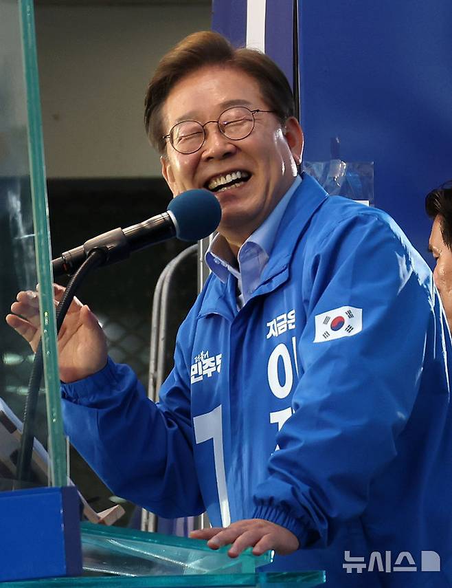 [인천=뉴시스] 조성우 기자 = 이재명 더불어민주당 대선후보가 21일 인천 계양구 계양역 앞에서 열린 유세에서 모경종 의원 관련 발언을 하다 웃음을 터트리고 있다. 2025.05.21. xconfind@newsis.com