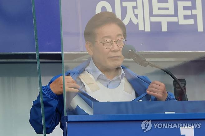 (인천=연합뉴스) 김주성 기자 = 더불어민주당 이재명 대선 후보가 21일 자신의 지역구인 인천광역시 계양역 앞 유세에서 방탄유리, 방탄조끼 비판에 대해 항변하던 중 점퍼 속 방탄조끼를 보여주고 있다. 2025.5.21
