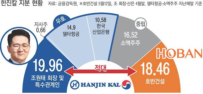호반건설은 지난 12일 보유한 한진칼 지분율이 17.44%에서 18.46%로 높아졌다고 공시했다. 한진그룹과 지분 공동보유 계약을 맺고 있는 한국산업은행 몫을 빼면, 4월 말 기준 조 회장 및 특수관계인 지분율은 19.96%로 호반건설과 1.5%포인트 차이에 불과하다. 델타항공(14.9%)과 산업은행(10.58%)의 지분이 우호지분으로 분류돼 당장 지배력을 유지할 것이란 관측이 우세하지만 조 회장으로선 위기감이 커진 셈이다.