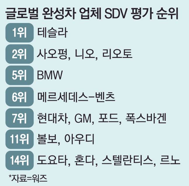 SDV 개발 평가에서 1위는 테슬라가 차지했다. 이후 중국 완성차 업체들 중에서도 스타트업인 샤오펑, 니오, 리오토 3사가 공동 2위에 올랐다. 5위와 6위는 각각 BMW와 메르세데스-벤츠가 차지했다. 현대차는 제너럴모터스(GM), 포드, 폭스바겐과 함께 공동 7위를 기록했다. 도요타, 혼다 등 일본 업체들과 스텔란티스, 르노가 최하위에 올랐다.